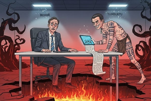 Výlet do pekla kde sú tresty montáž IKEA nábytku a nekonečné mítingy. Zistí, že jeho práca nebola až taká zlá. Prejde testom mŕtvosti a dostane…